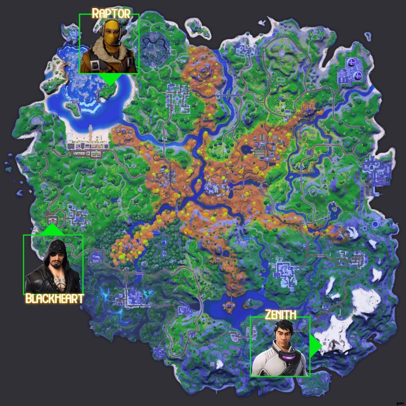 フォートナイトで チャプター 2 シーズン 6 の第 3 週では、島の 3 つのボス (ラプター、ゼニス、またはブラックハート) のいずれかを排除するタスクが提示されます。これらのボスは非常に離れた場所に散らばっており、すべてマップの端にあります。このガイドでは、それらすべてを見つけることができる場所を紹介します。