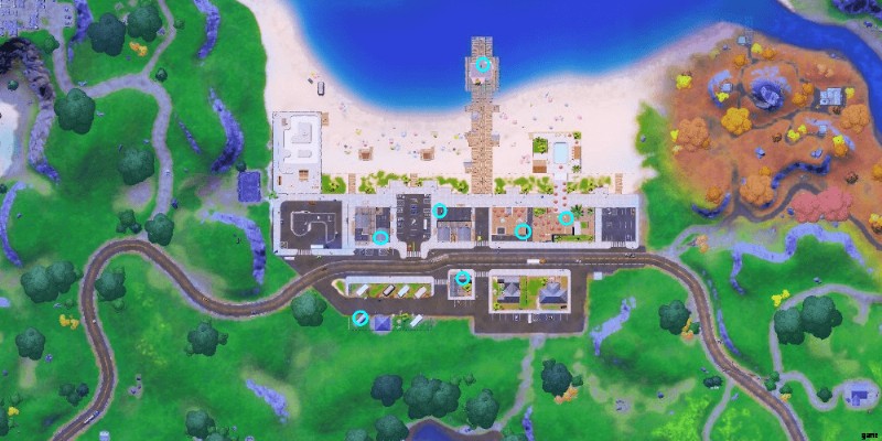 上のマップは、すべての金庫の出現エリアを示しています。このクエストを完了する最も簡単な方法は、島の西側に留まり、Sweaty Sands と Holly Hedges で金庫を探すことです。これら 2 つのエリアを詳しく見て、スポーン ポイントがどこにあるかを正確に確認しましょう。