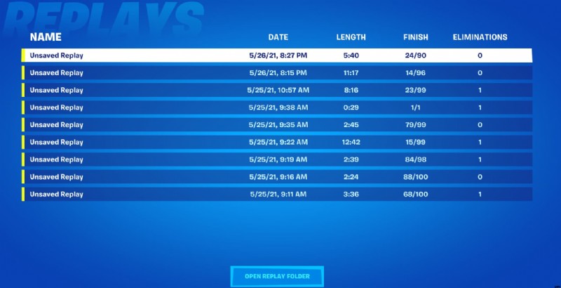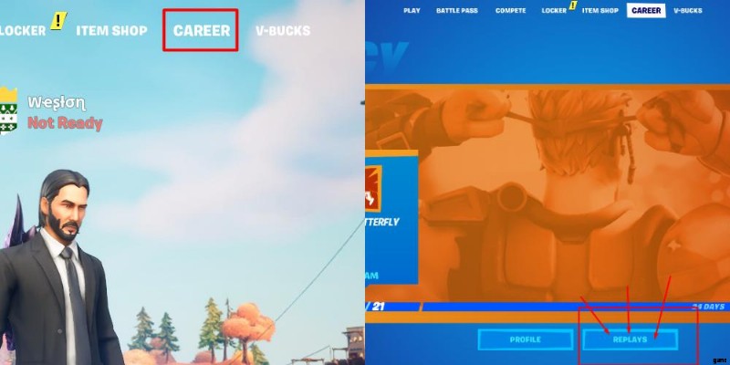 試合のリプレイには、2 つの簡単な手順でアクセスできます。上の画像を使用すると、ゲーム内でフォルダーにアクセスするために選択する必要がある 2 つのメニュー オプションが表示されます。 フォートナイト メイン メニューで、キャリアを選択します 左の画像で赤く強調表示されているタブ。そのメニューで、[リプレイ] をクリックします。 右の画像で赤くハイライトされているボタン。そこから、下の画像のようなものが表示されます。