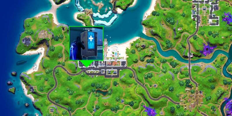 このタスクを説明するために、Believer Beach (以前の Sweaty Sands) にある Mending Machine を使用します。上の画像では、このエリアのメンディング マシンが町の西端にあるガソリン スタンドの外にあることがわかります。ここで修復機に近づき、以下の手順に従ってシールド ポーションを購入してください。