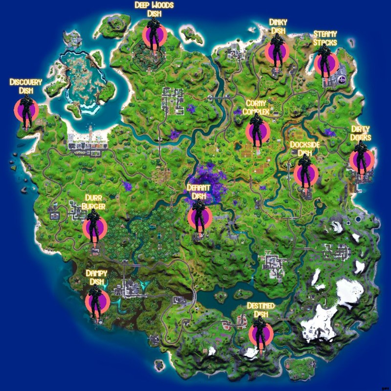 - ダンピー ディッシュ: マップの南西端にあるスラーピー スワンプの主要複合施設の南西。