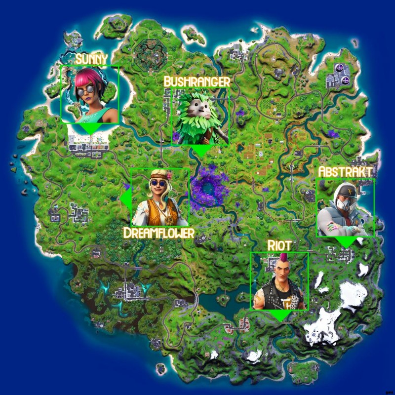 Amazonでフォートナイトのアクションフィギュアを見る第 1 週のレジェンダリー クエストの最初の段階では、5 人の NPC のうち 3 人と対話する必要があります:Sunny、Abstrakt、Dreamflower、Riot、または Bushranger。これはかなり単純なクエストであり、綿密な計画は必要ありません。下の地図で各 NPC の場所を確認できます。