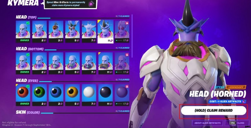 購入したいスタイルを選択してください。スタイルが異なれば、価格も異なり、希少性も異なります。希望のスタイルを選択したら、(長押し) 報酬の受け取りを長押しします。 それを主張するためのボタン。これは、インベントリに十分なエイリアン アーティファクトがある場合にのみ機能します。