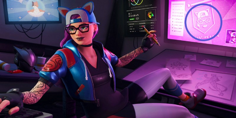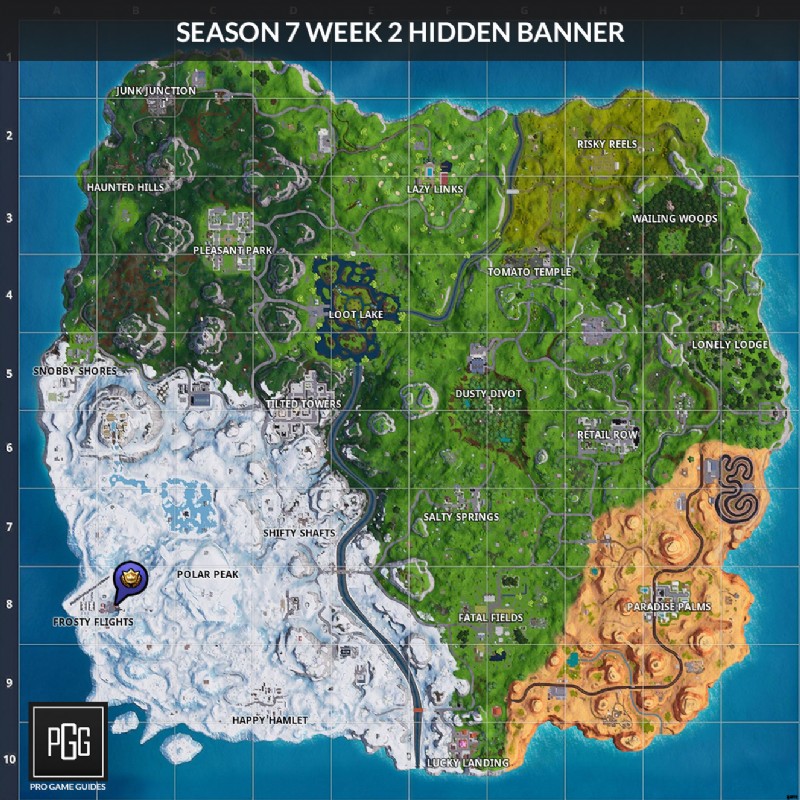 第 2 週は、バトル スターの代わりに隠されたバナーを探します。 Once you've completed all of your challenges for this week, you'll get a loading screen featuring the new Lynx skin! She's apparently a graphic designer, and the banner is shown on her screen. This location can actually be found rather close to last week, but it is actually in Frosty Flights.