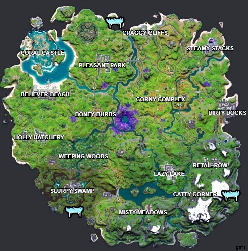 これは、プレイヤーがフォートナイトでこれらの場所の正確な位置を見つけるのに役立つ地図です.