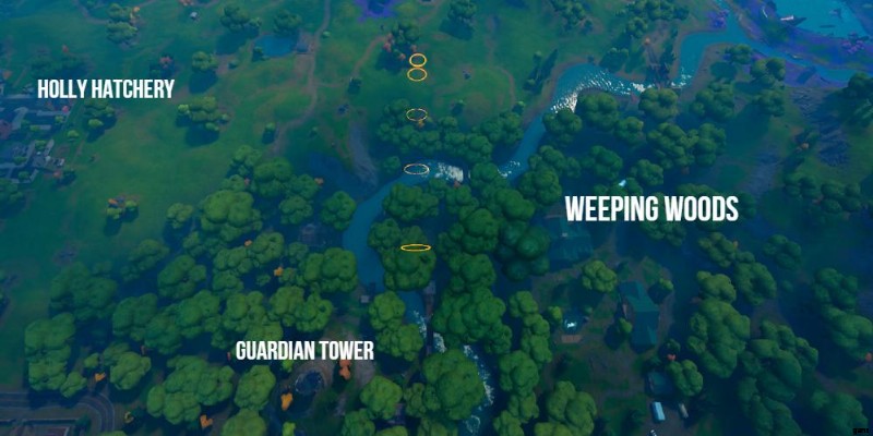 滑る5つのリングがあります。このクエストを完了する最善の方法は、最初にパーティー バスから飛び降りたときの試合開始時です。最初に行う必要があるのは、しだれの森の上に飛び出すことです。 下る途中で、Weeping Woods の上をホバリングし続けることを確認してください。近づくと、ウィーピング ウッズ ガーディアン タワーとウィーピング ウッズ キャンプ場の間のはるか上空にリングが浮かんでいることに気付くでしょう。