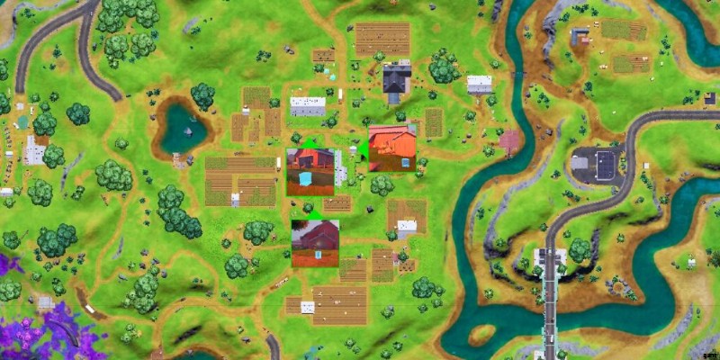 下の画像は、パレットを配置するための 3 つの異なる場所を示しています。クエストを完了するために配置する必要があるのは、それらのうちの 1 つだけであり、同じ試合で行う必要はありません。コーニー コンプレックスはドロップ ポイントとして人気があるため、最初のストーム サークルが近づくまで待ったほうがよいかもしれません。