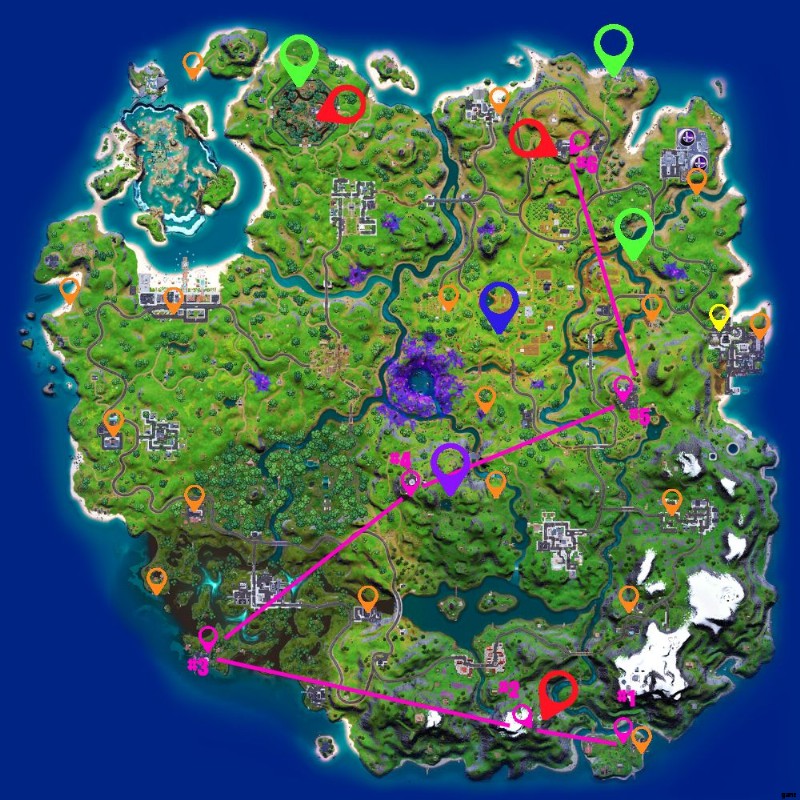 以下のマップは、今週のクエストのすべてのスポーンの場所と特定の場所を示しています。詳細が必要な場合は、地図の下の指示に従ってください。