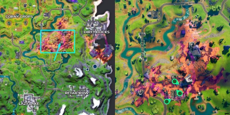 最初に行う必要があるのは、適切な場所に移動することです。 Destroyed Dish は、シーズン 7 の Dockside Dish に代わる新しいランドマークの場所です。Dirty Docks のすぐ西にあります。下の左側の画像では、青色で囲まれています。