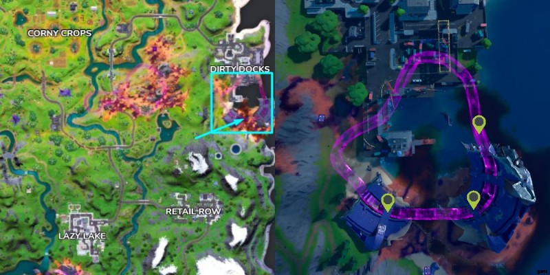 Fortnite の Dirty Docks の南にある残骸で Crystalline Blue のボトルを見つける場所