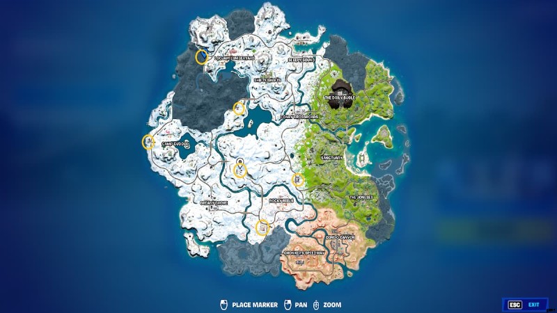 上の画像は、プレイヤーが Fortnite チャプター 3 シーズン 1 でジェム フラグメントを収集するために訪れることができるすべてのガソリン スタンドを示しています。以下の手順に従って、対戦相手がその場所に到着する前にジェム フラグメントをすばやく見つけてください。