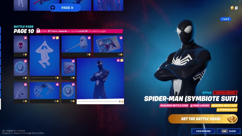 スパイダーマンのシンビオートの衣装 10ページにあります バトルパスの、そしてプレイヤーはすべての化粧品にアクセスするために87 BPの報酬を必要とするか、最初にレベル90に到達する必要があります.衣装自体には 8 つのバトル スターが必要なので、必ず保存して、この象徴的な衣装をできるだけ早くロック解除してください。