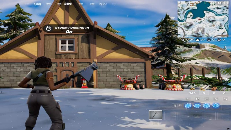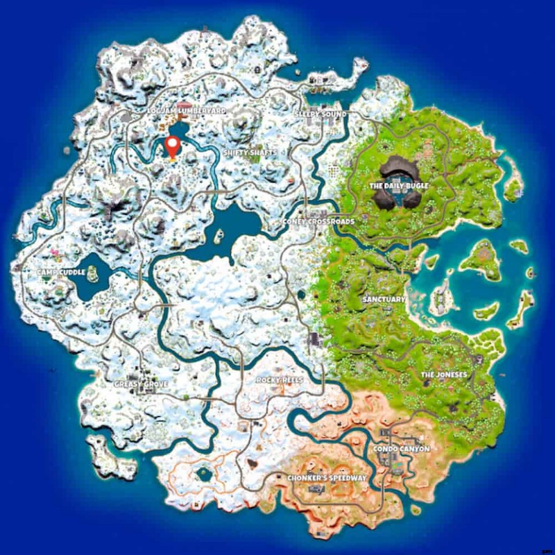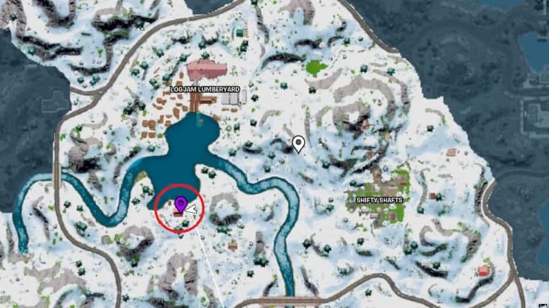 前述のように、池のはずれにある Logjam Lumberyard の南にあるくるみ割り人形の家を見つけることができます。家は、クリスマスをテーマにしたクワッド クラッシャーでさらに簡単に識別できます キャビンの外に存在します。画像参照用に上の画像を使用してください。