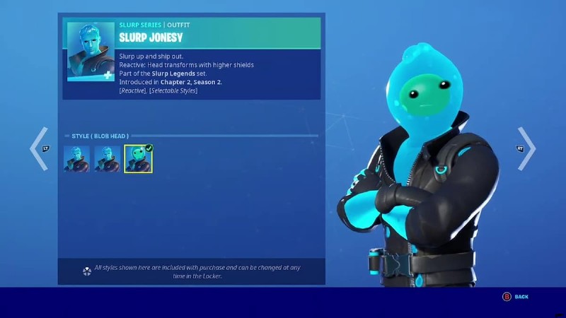 Agent Jonesy のすべてのバージョンの中で、Slurp Jonesy は Fortnite で最も人気がありません。これにはいくつかの理由がありますが、主な理由は彼の間抜けな真っ黒な目です。衣装は反応的で、より高いシールドで変身しますが、プレイヤーがこのスキンをインベントリスロットに追加する動機はほとんどありません.