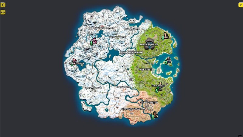 Amazonでフォートナイトのアクションフィギュアを見る最初の雇用可能な NPC は エージェント ジョーンズ です 、そして彼の場所は地図上で永続的ではありません。エージェント ジョーンズは、フォートナイト チャプター 3 シーズン 1 の最初の 4 つの 7 つの前哨基地の 1 つにランダムにスポーンします。プレイヤーは下の画像に従って、ゲーム内のすべての雇用可能な NPC を見つけることができます。