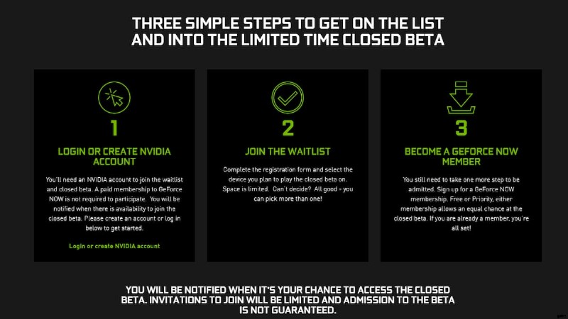 - 新規メンバーは GeForce Now にサインアップする必要があります。クローズド ベータ版の資格を得るために有料版は必要ありません