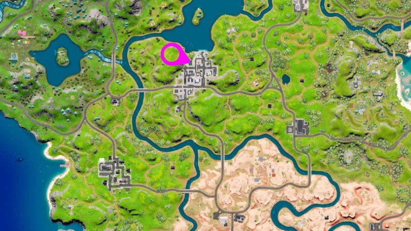 上の地図では、 Galactico が彼の本拠地である Tilted Towers の北西の角にあるサッカー場であることがわかります。傾いた塔は、マップの中央近く、Logjam Lumberyard から湖の真向かいにあります。