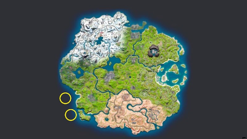 第 12 週のクエストの 1 つで、プレイヤーは 漂流者 を訪れる必要があります または ポーントゥーン モーターボートで。これらの名前のないランドマークは両方とも、マップの南西端にあります。 .参考までに、プレイヤーは下の地図で黄色でマークされた場所に移動する必要があります: