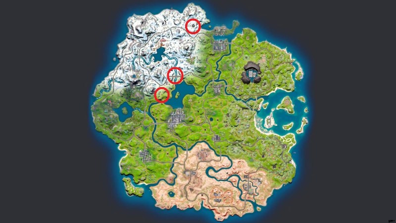 シェルまたはハイウォーター ランドマークはマップの北側、スリーピー サウンド POI のはるか西にあります .同様に、ハッピー キャンピングカー ランドマークは Tilted Towers POI の北にあります 秘密の洞窟へ向かう途中。 ベヒーモス ブリッジ 目印は赤い橋 Shifty Shafts POI の南にあります 、そしてこれはプレイヤーがスパイダーマンのミシックウェブシューターを見つけることができる場所です.参考までに、プレイヤーは以下のマップをたどることができます: