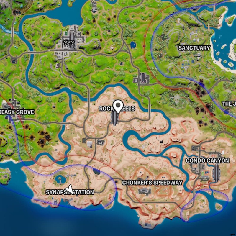 シナプス ステーションはマップの南端にあります 、チョンカーズ スピードウェイのはるか東 ポイ。この新しい POI はセブンに属し、そのデザインは驚くほどセブン アウトポストに似ています。プレーヤーは、フォートナイト チャプター 3 シーズン 2 のシナプス ステーション POI に到達するための参照として、以下のマップ イメージをたどることができます。