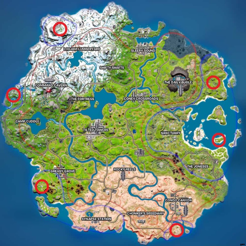 Seven Outposts は名前のないランドマークであるため、プレイヤーはそれらを見つけるのに苦労する可能性があります。上の地図の赤い丸の参照に従って、今シーズンのすべての 7 つの前哨基地を見つけてください。 1 回のゲームでこれらの 7 つの前哨基地にアクセスして、このクエストをすばやく完了することができます。
