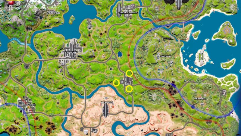 セントラル ガソリン スタンドは、3 つの主要な POI の間のマップの中央に理想的に配置されています。プレイヤーは、ティルテッド タワーズから南東に移動する必要があります。 、サンクチュアリの西 、またはロッキー リールズから北東 このランドマークに到達するための POI。