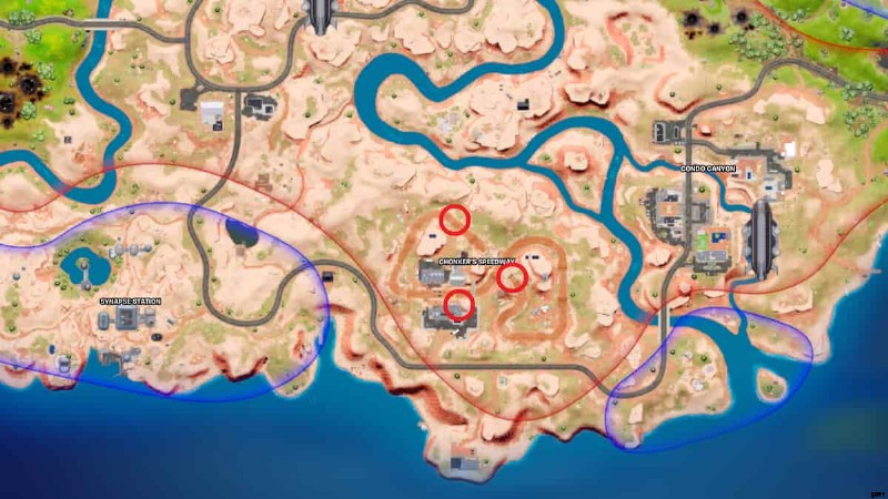チョンカーズ スピードウェイは、シーズン 2 で上空に IO 飛行船がホバリングしていない数少ない POI の 1 つです。プレイヤーはこの場所に着陸し、上のマップの 3 つの赤いマーカーすべてにアクセスして、この地域のオムニ チップをすべて獲得できます。