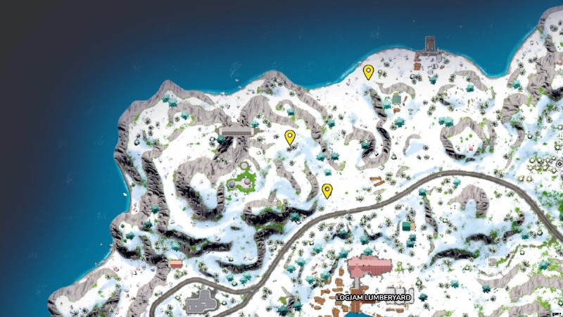 クロンボサイズの雪山チャレンジを完了するには Fortnite では、マップ上の 3 つの異なる場所を訪れる必要があります。これらの 3 つの場所は、Logjam Lumberyard の北にあります。 .下の地図は、フォートナイトにあるこれらのクロンボ サイズの雪塚のおおよその位置を示しています。