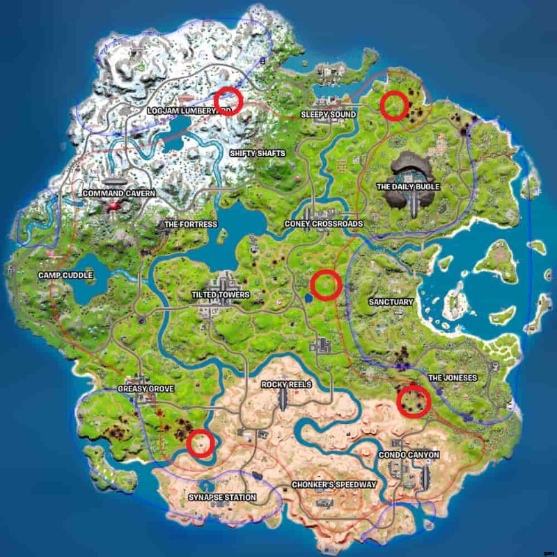 IO Outpostsに関しては、Fortnite Chapter 3 Season 2には数しかなく、プレイヤーは上の地図の赤いマーカーをたどってそれらを見つけることができます.これらの IO Outposts にアクセスし、チェストと弾薬箱を開いてチャレンジを完了してください。