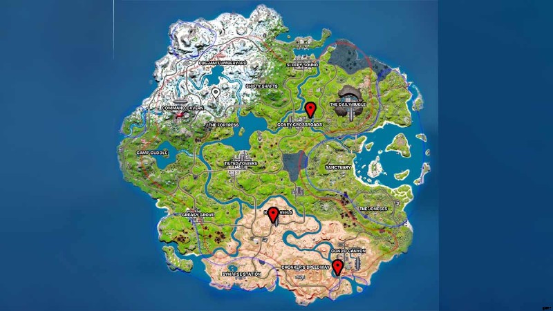 前述のように、道路の障壁はさまざまな主要な POI、より具体的には飛行船の近くにあります。ロッキー リール、コニー クロスロード、コンド キャニオンの 3 つの場所をハイライト表示しました。これらの障害物は上記のフォートナイト マップに存在します。
