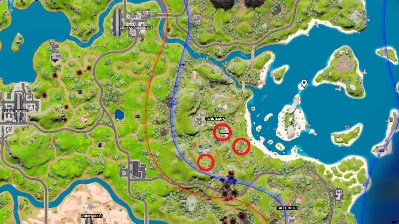 サンクチュアリはホットドロップの場所であり、プレイヤーは対戦相手もこのエリアに着陸することを期待できます.上の画像の 3 つの赤いマーカーすべてにアクセスする前に、まず武器と盾を見つけるのが理想的です。これは第 4 週のレジスタンス クエストの最後のチャレンジであり、プレイヤーは来週のアップデートでさらに多くのクエストが登場することを期待できます。
