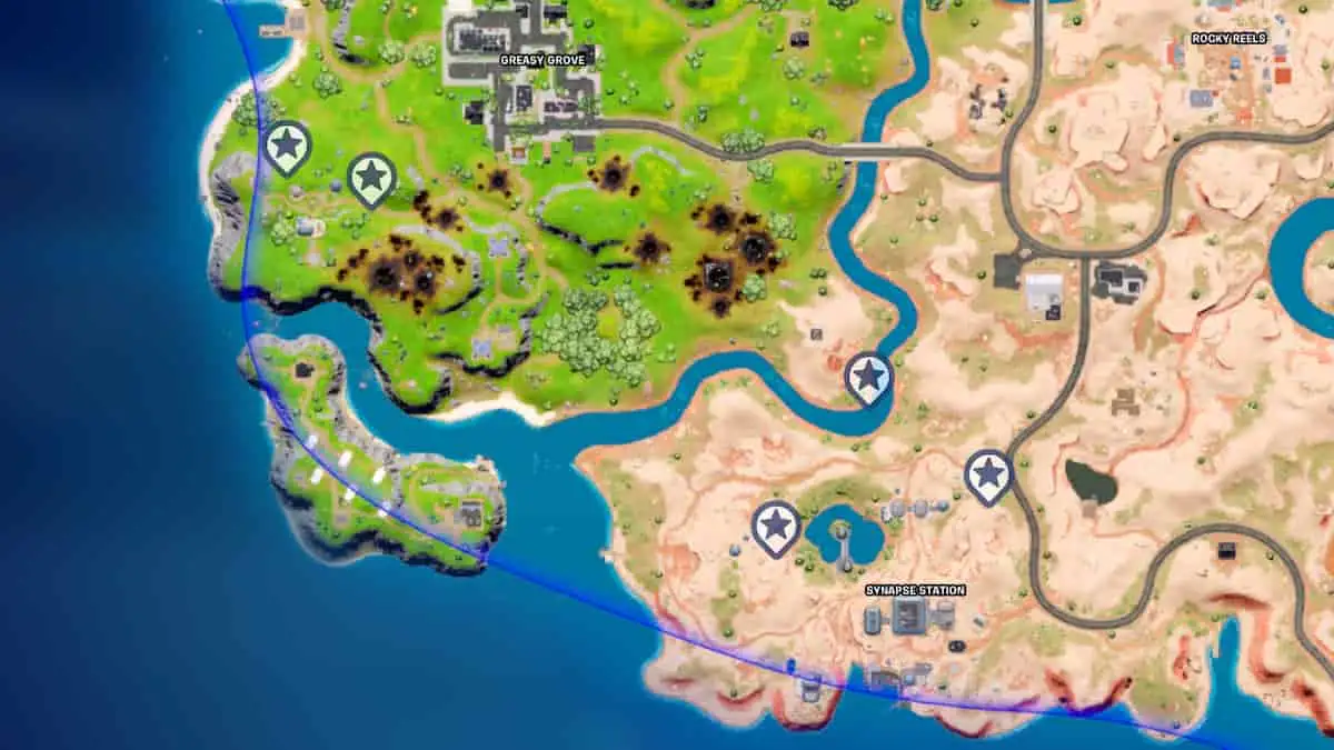 エネルギーの変動は、レジスタンス ウィーク 8 クエストのマップに示されているように、ルート レイク島のランドマークでは正確には見られません。代わりに、プレイヤーは湖の向こう側のエリアの周りにエネルギー変動の明るいオレンジ色のフレアを見つけるでしょう.これまでのところ、エネルギー変動ポイントの 2 つの異なる場所が見つかりました。1 つは 要塞の南 です。 POI と、配送センター の近くにあるもう 1 つの場所 ランドマーク。