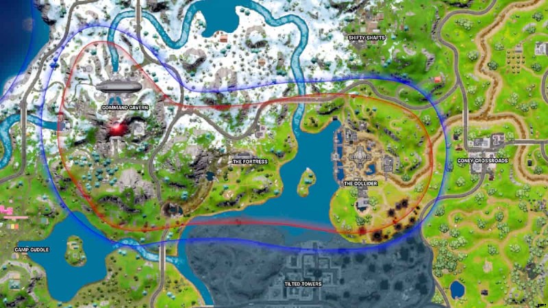 エア ストライク グレネードは、地上戦利品、チェスト、サプライ ドロップとしてスポーンするため、簡単に見つけることができます。クエストではプレイヤーが POI の 1 つでこの爆発物を使用する必要があるため、プレイヤーはコライダーまたは要塞に直接着陸することをお勧めします。これら 2 つの POI は互いに反対側にあり、プレイヤーは上のマップをチェックして正確な場所を確認できます。戦闘に参加する前に武器と盾を入手し、サードパーティのさまざまなチームに空爆を使用してください。エアストライクは範囲ダメージを与えるため、複数の敵が近くに隠れている場合に最適です。