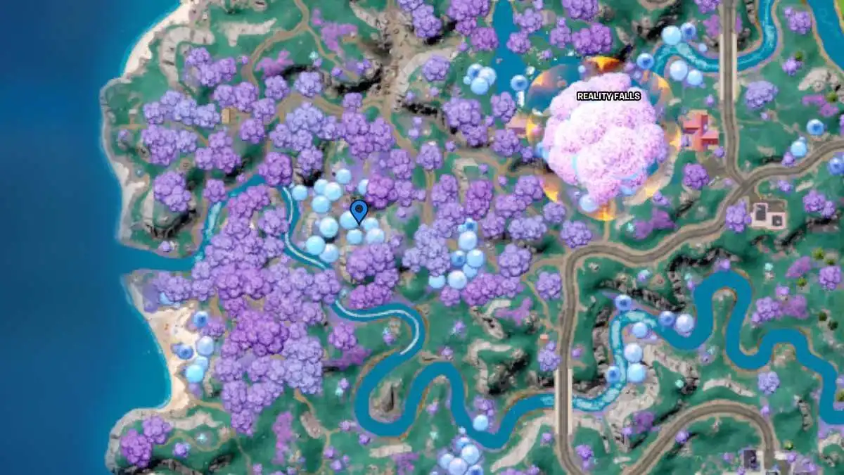 Groovy Groveは、物語を語る紫色の葉のおかげで、そこに移動すると簡単に認識できます. Fortnite の島の南西部にある Groovy Grove を見つけることができます。マップの一番端に木立があります。 Reality Falls に到達していない場合は、引き続き西に向かう必要があります。 Reality Falls Tree を過ぎて少し南西に進みます。どこにでも紫色が見られるようになると、適切な場所にいることがわかります。