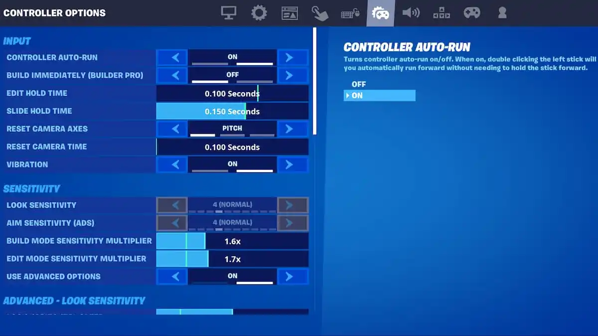 [コントローラー オプション] タブには、Fortnite でのゲームプレイを強化するために必要な主要なオプションがあります。このタブでは、感度、ホールド タイム、コントローラーのデッド ゾーンなどのオプションを微調整できます。これは、設定メニューにコントローラーのシンボルで示されます。