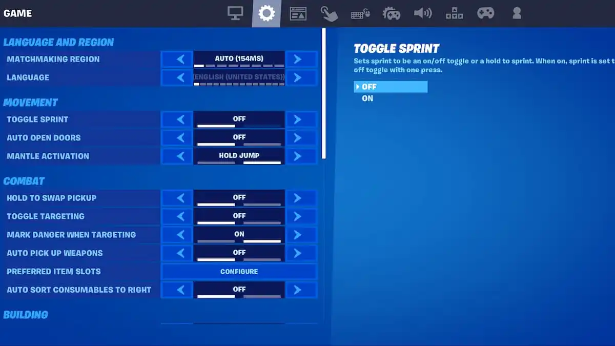 ゲーム設定の下には、自動スプリント、ドアの自動開閉、アイテムの自動ピックアップ、建物の選択など、ゲームプレイ体験をよりスムーズにするためのオプションがあります。このタブは、円形の設定ロゴで示されます。