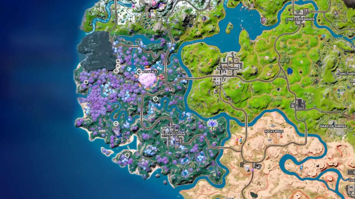 間欠泉は自然に発生する温泉で、水の流れを放ち、プレイヤーが短時間空中に浮くことができます。 西部セクションでのみ見つけることができます Greasy Grove周辺のマップの 、リアリティ フォールズ .上記のマップ リファレンスの白い円をたどって、Fortnite のすべての間欠泉を見つけます。 危険公園 Reality Falls の西にあるランドマークは、複数の間欠泉を見つけるのに最適な場所です。同様に、移動したデポ とシェリー ショールズ グリーシー グローブの西にあるランドマークは、フォートナイト チャプター 3 シーズン 3 の間欠泉を見つけるのに理想的なスポットです。
