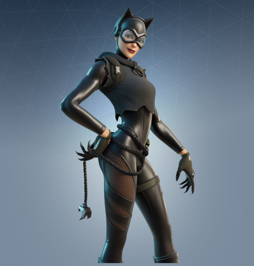 キャットウーマンは狡猾で魅惑的なキャラクターであることで悪名高いので、フォートナイトが彼女の正義を果たすスキンを彼女に与えるのは当然のことです.彼女の黒い革のボディー スーツは、ウエストの周りがスリムですが、曲線的な腰を見事に見せており、フィッシュネット パッチの下の皮膚にいくつかのピークがあります。
