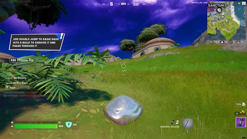 ただし、これらのスロー可能オブジェクトを確実に見つける別の方法があります。 プレイヤーはつるはしを使ってクローム オブジェクトを破壊することで、クローム スプラッシュを獲得できます 上の画像に示すように。これらのオブジェクトは、新しいクロムをテーマにしたエリアにあります。 島の西部、ヘラルドの聖域、シマリング シュライン、光沢のあるラグーンにあります。