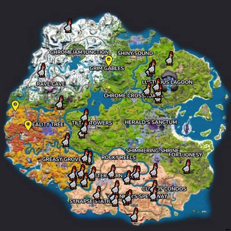 ゾンビとゾンビ ニワトリはフォートナイトメアのために島にいます。彼らを追い詰めるのはあなたの仕事です。卑劣なアンデッドは特定の場所にのみ現れます。ただし、このチャレンジの良いところは、ニワトリかゾンビか、最初に見つけたものなら何でも、どちらを狩りたいかを選択できることです。ニワトリは、特に砂漠のバイオームの周りで、マップ全体を豊富に歩き回ることができるため、見つけやすくなります。ゾンビは、スポーンできるいくつかの場所にとどまっています。