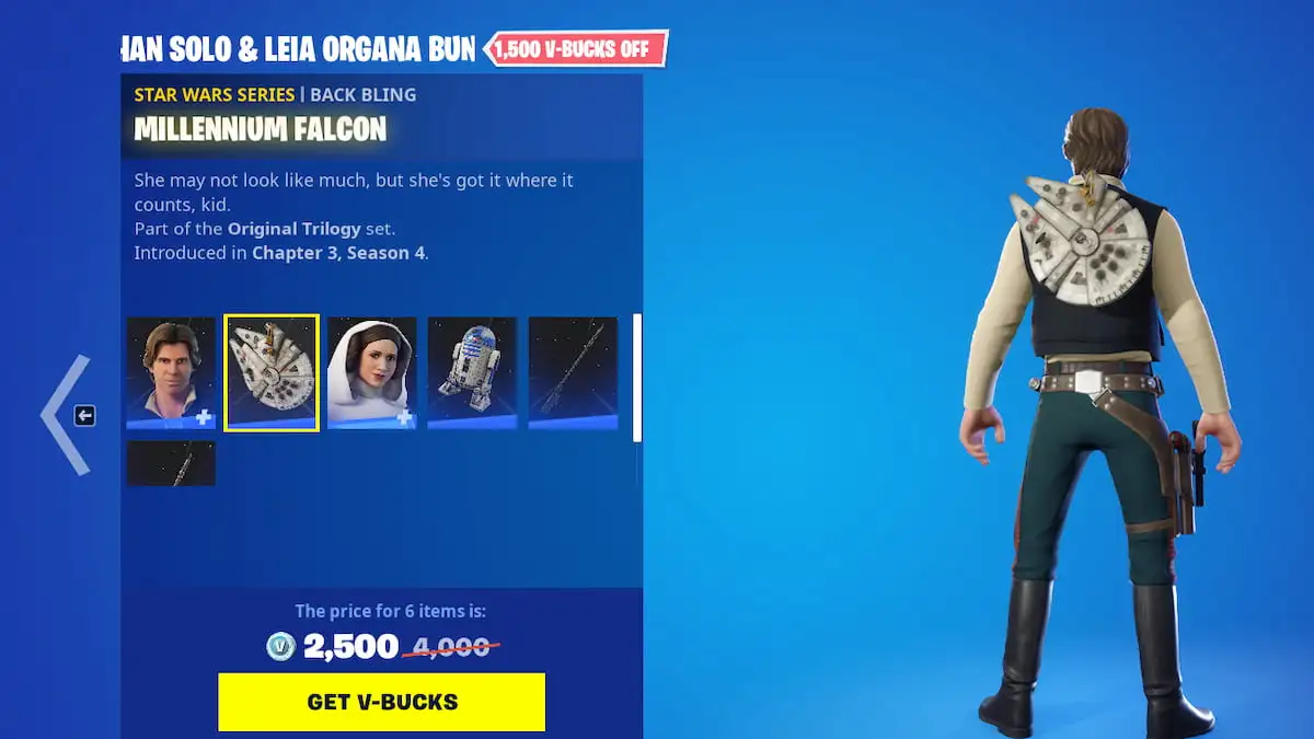 フォートナイト チャプター 3 シーズン 4 では、最も人気のあるスター ウォーズの 3 人のキャラクター、ルーク スカイウォーカー、レイア オーガナ、ハン ソロがゲームに参加します。 3 人のキャラクターすべての衣装はアイテム ショップで購入できます。Star Wars コレクションを完成させるには、V-Bucks で購入する必要があります。 Epic Games は、プレイヤーが Skywalker Week クエストを完了して XP を獲得できる一連のチャレンジも追加しました。フォートナイトでミレニアム ファルコン バック ブリンブリンを取得する方法は次のとおりです。