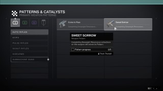 どの武器が作成可能かをどうやって知るのですか?そのためには、インベントリの勝利の道のりタブに移動し、「パターンとカタリスト」セクションに移動する必要があります。ここでは、作成可能なすべての武器の完全なリストと、それらのロック解除の進行状況を確認できます。上のスクリーンショットでは、Sweet Sorrow オートライフルを 5 回完了する必要があることがわかります。これは、ロックを解除するのがより難しい武器の 1 つです。ただし、その仲間のオートライフルであるCome To Passは、2回完了するだけで済みます。いずれかの武器で Resonance トラックを完了すると、通常の銃に戻るだけなので、パターンのロックを解除するには、Sweet Sorrow の 5 つの個別の Deepsight Resonance バージョンを実際に見つけて完了する必要があることに注意してください.