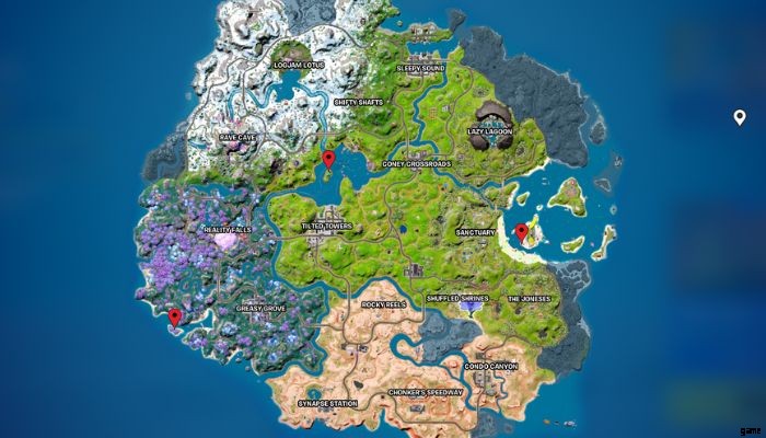 このクエストで唯一難しいのは、これら 3 つのエリアを見つけることです。プレイヤーが簡単に操作できるように、以下の地図にこれらの場所をマークしました-