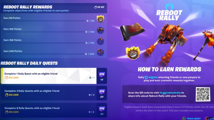 リブート ラリーは期間限定で開催され、10 月 3 日までにすべてのクエストを完了して報酬を受け取る必要があります。さらに、報酬の資格を得るには、フォートナイトのプレイ時間が 2 時間未満のフレンドを見つける必要があります。フレンドのリストを確認すると、特定のフレンドの名前の横に再起動のシンボルが表示されます。これらのフレンドは、リブート ラリーのクエストを手伝ってくれる資格があると見なされます。完了するクエストは 6 つあり、どのモードでも完了することができます。適切なポイントが貯まると、報酬を請求できます。以下は、適格なフレンドを招待して助けてもらった後、リブート ラリーで完了する必要があるすべてのクエストです。これらのクエスト、特にデイリー クエストはすべて 1 日 1 回完了できます。