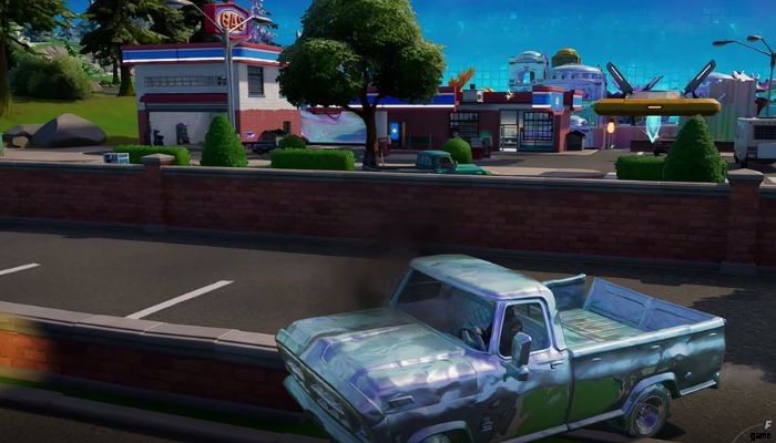 - Chromed Splash を十分に獲得したら、Cars を見つけます。車はフォートナイトでは珍しいものではありません。ガソリンスタンドに行って車を入手するか、マップ全体のほぼすべての場所で入手できます。 Chrome Splash を投げて Chromed になったら、少し遠ざけます。
