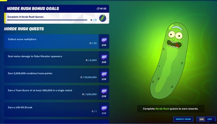 Pickle Rick Backbling は、プレイヤーが Horde Rush モードをプレイすることによってのみ獲得できる報酬です。 Fortnite のクエスト タブでは、Horde Rush モードをプレイしているときにのみ利用できる Horde Rush クエストを取得できます。 Horde Rush モードもハロウィーン アップデートで導入されたハロウィーンをテーマにしたモードですが、このモードはあと数日続き、プレイヤーはクエストを完了して報酬を得ることができます。