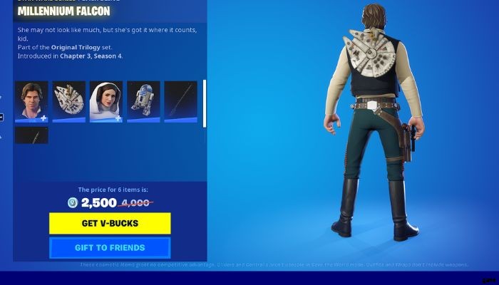 アイテムショップのハン・ソロとレイア・オーガナのバンドルには、ミレニアム・ファルコンのバックアクセサリーとその他のアイテムが含まれています。このバンドルの価格は 2500 V-Bucks で、Han Solo の衣装、Millenium Back Bling、Leia Organa の衣装、R2-D2 Back Bling、Electro Staff、Vibro Staff が含まれています。または、Han Solo Outfit Pack を 1500 V-Bucks で購入して Millenium Back Bling を獲得することもできます。