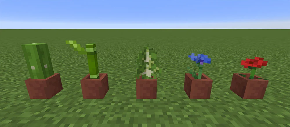 ポットを使用する必要があるのは、好きな場所に置き、その中に好きな植物を追加することだけです!植木鉢には、花、竹、苗木、サボテン、キノコ、菌類など、あらゆる種類のものを入れることができます。それらのいくつかがどのように見えるかの例を次に示します: