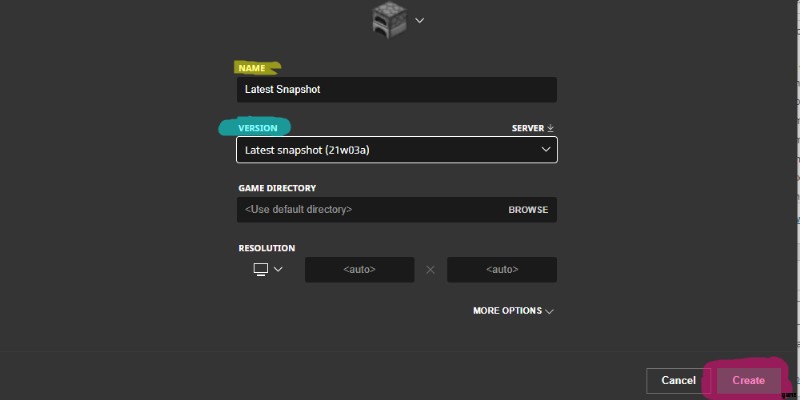 このステップには 3 つの部分があり、上の画像ではすべての部分が異なる色で強調表示されています。黄色のハイライトは最初のステップです。ここに名前を入力します 使用するスナップショットの e。このプレイ バージョンをリリース時に最新のスナップショットにしたい場合は、最新のスナップショットと入力することをお勧めします。
