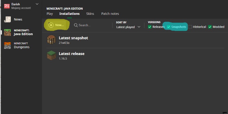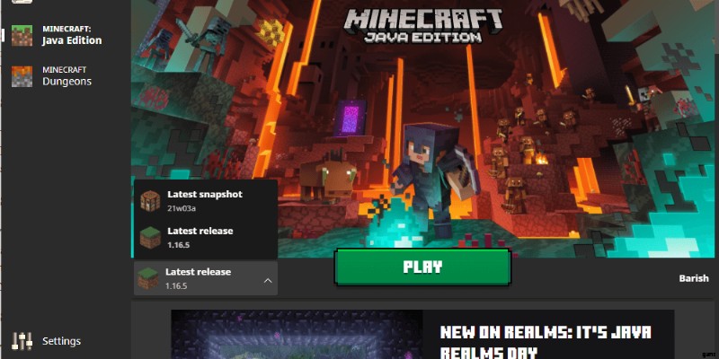 次のステップは、再生したいスナップショットを選択することです。青色で強調表示されています。毎回最新のスナップショットを再生する場合は、[最新のスナップショット] を選択します ここのドロップダウンメニューで。古いスナップショットや古いバージョンの Minecraft をプレイしたい場合は、 プレイしたいゲームを選択 .